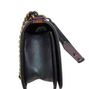 • This bag is crafted of iridescent soft-grained chevre goatskin leather with a purple sheen that can turn light-to-dark depending on lighting. It features an rainbow metal shoulder/crossbody chain with a shoulder pad, a diamond-quilted flap with a linear-quilted border and an iridescent CC boy push lock. The flap opens to a black fabric interior with a patch pocket.