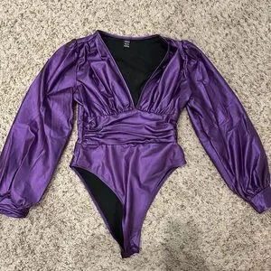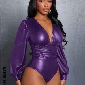 SHEIN Slayr Summer Music Festival Elegant And Sexy Deep V Neck Balloon Sleeve Long Sleeve Purple PU Leather Women's Bodysuit.