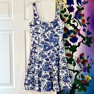 The gorgeous Staud Wells Mini Dress reimagines old Hollywood glamour with its figure-flattering, corset-style bodice & pleated A-line skirt. In stunning Blue Toile, the elegant skirt is feminine & flirty, while the fitted top is sure to get you noticed. Pair with your favorite accessories & heeled sandals for a chic cocktail look. Featuring a square neckline & concealed back zipper. Made of lightweight cotton poplin with some stretch, 98% cotton, 2% spandex. Approximate size 2 unstretched bust 16 1/4”, length 34 1/2”. Approximate size 4 unstretched bust 16 3/4”, length 36”. Approximate size 8 unstretched bust 18”, length 37”. Rare & hard to find in this color & style, sold out everywhere.