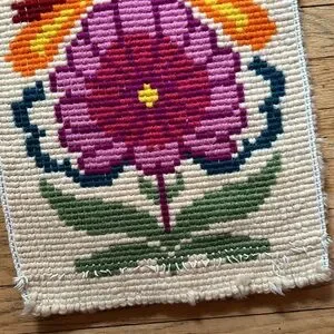 Beautiful vintage psychedelic flower power latch hook decor rug. Could sew on a backing to be hung on wall or use as a small rug. In good condition.14” x 36”