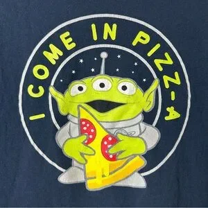 Disney Toy Story Navy blue t-shirt featuring the little alien holding pizza with the text 'I Come In Pizz-a'. Has some light fading and cracking. Shirt looks smaller than 2X see measurements. Could fit a large or possibly medium - unisex.