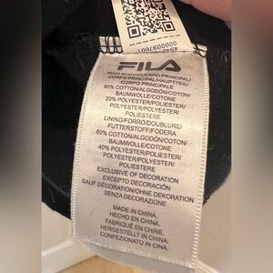 FILA Sweatshirt & Fleece Hoodie Men . Made in China. Logo embroided in center of chest. Black , Gray & White Color Closure: Pull on & Drawstring . Size : US: XXL, F/UK:XXL , CAN:XXL/ TTG ( pit to pit : 27.5”, shoulder to hem: 28”, Length:30”) Material : Main Body: 80% Cotton & 20% Polyester. Lining: Forro/ Doublure : 60% : Cotton & 40% Polyester Performance activity: Running, Jogging , Gym , Training & Walking . Almost new , non tears non stain , non flaws . Home: Smoke/ Pet : Free
