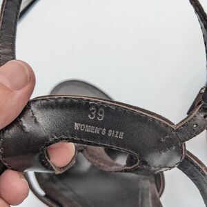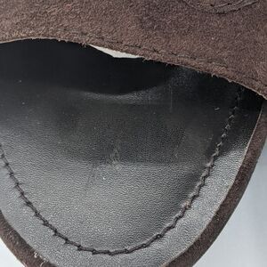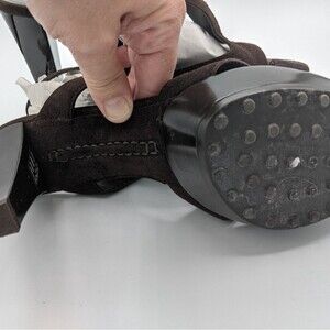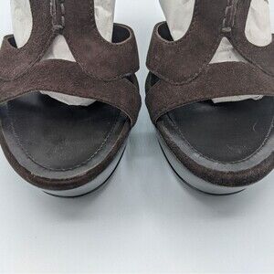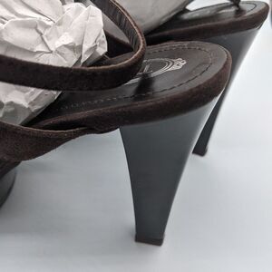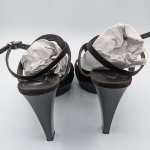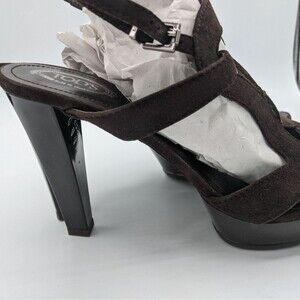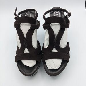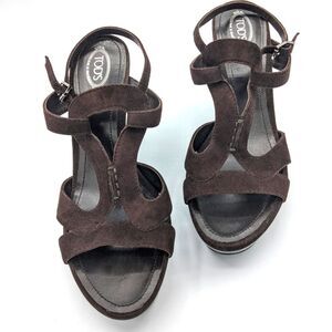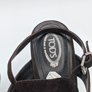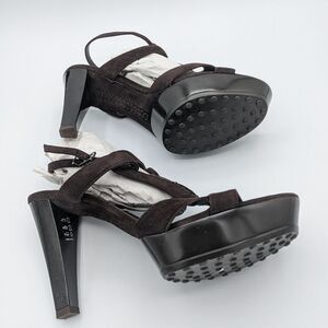 Velvety soft chocolate brown suede sandals from Tod's with crossover straps and an ankle strap with the side buckle. 4" high heel and 1" platform. Great for fall; combine with a vibrant pair of tights. Never worn; the only imperfection is a slight scratch in the toe bed area (very small, no color removed). Tried on, but never worn. See pictures for details.