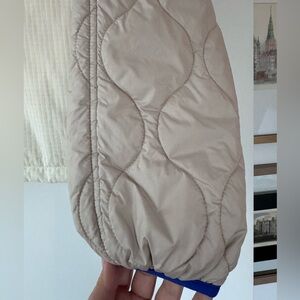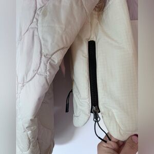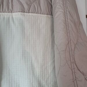 Thinner (like a cross between windbreaker and puffer) jacket with colorful accents. Quilted fabric, tan and cream, zips up the front and the sides. Has a hood. Water resistant. Cropped and quite warm! Lined and vented.