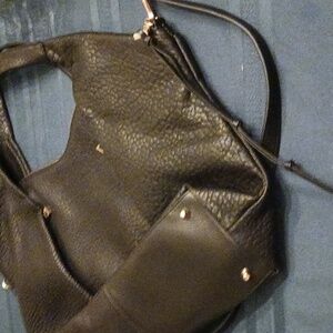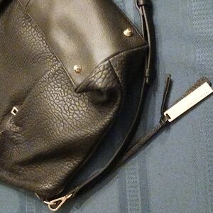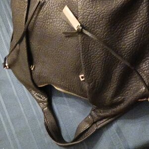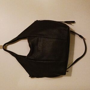 Vince Camuto Steph tote black pleated lamb leather, top zipper closure, 2 hidden vertical zippered pockets and 1 magnetic closure slip pocket outside, double handles and adjustable strap, inside 3 slip pockets and a zip pocket, key strap, Camuto hangtag, long 2 knots decor strap, all metal gold tone. Excellent condition.