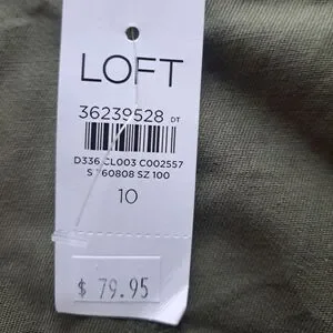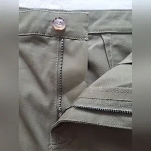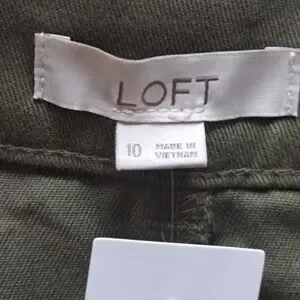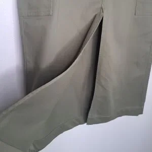 This Ann Taylor LOFT cargo skirt is perfect for any bohemian or hippie themed outfit. The military green color and solid pattern give it a unique and stylish look. The skirt features an open front desing with zipper closure and pockets for added convenience.