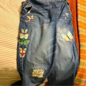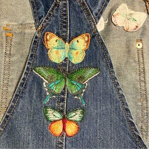 Women’s size Medium denim overalls, Mossimo brand. I added 16 embroidered butterflies of various kinds, embroidered directly onto the overalls. These are not patches. Gorgeous designs by Urban Threads. A lot of time and work and thread went into these. They fit me so I will keep them if they don’t sell. Absolutely love them!
