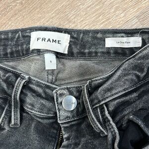 SO comfy w/perfect amount of stretch! Mid/high rise (~13”) w/34” inseam and approx 10” flare. The perfect in between of dark gray and black. Worn 2x! Pristine. A frame “size 1” is equivalent to a 2–4 or 26.