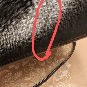 This MK Satchel is in good clean condition. There is one small flaw: a small scratch in the leather on the bottom of the bag (pictured/circled). This satchel has a beautiful mauve interior, features a snap closure, has gold hardware, and gold feet on the bottom. Inside of the bag is pretty much open, there is one zip pocket and behind the zip pocket is a small slip pocket, on the front of the bag it features a snap pocket, big enough for a phone or keys. Measurements for this bag are: 15"W x 10"H x 7.5"D inches. 4" Double Handles, 20-22" long adjustable strap. Comes from a smoke free pet free home.