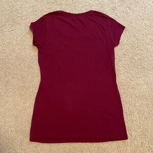 Tags: classic, tee, short sleeve, stretch, casual, business casual, maroon, nobo, no boundaries, warm tone, solid color, versatile, staple piece