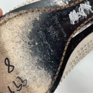 Sole starting to come off on L shoe, discoloration throughout, scuffs on toe, sharpie and wear on soles.