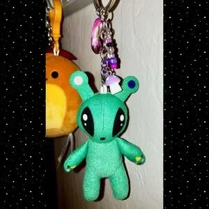 Let this playful little alien adorn your keys or bag! The hanging beaded charms help him make a fashion statement. He’d look adorable clipped to the fluffy wild fable purse also available in my closet!