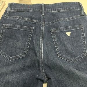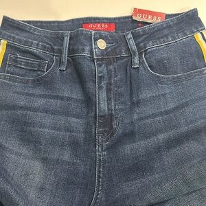 Guess skinny highwaisted stretch blue jeans w/ yellow & white stripes down sides of legs. Has iconic guess triangle logo on rear end . No flaws brand new with tags