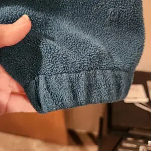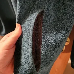 This is super nice and warm, will keep you warm on cold days, partial zip. Has pockets. The color is hunter green or dark green but my camera was having some trouble showing that. 100% polyester.