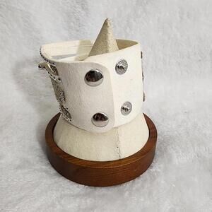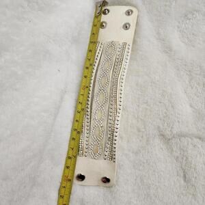 ◽️ White thick leather band/cuff bracelet with silver studs and clear jewels/crystals