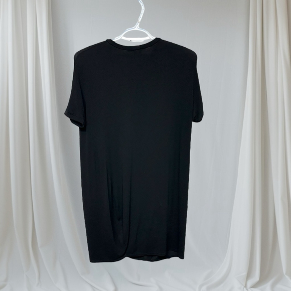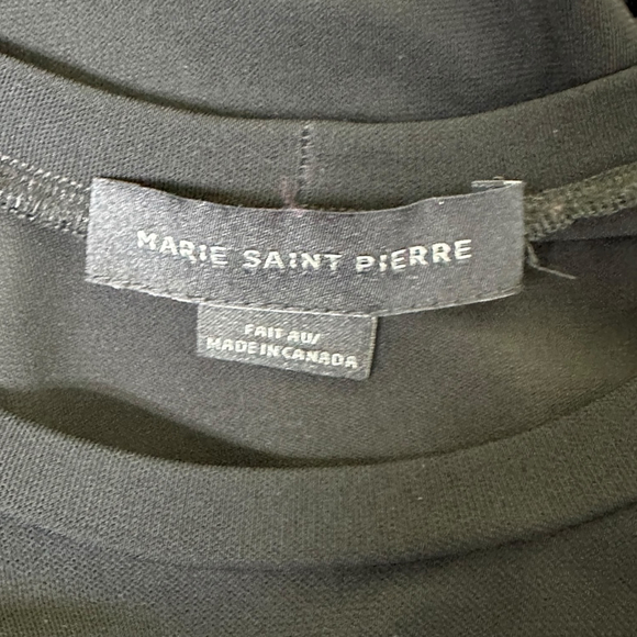Pre-owned Marie Saint Pierre black short-sleeved dress. Made in Canada. The dress is made of 92% viscose and 8% elastane, as indicated on the label. It features a twisted detail at the hem and a relaxed fit.