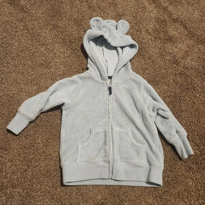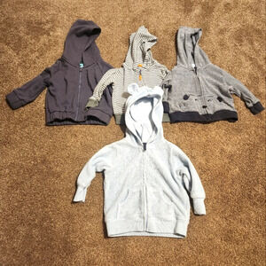 This set of 4 jackets is a good value! All are in good shape. Some are 3-6 Months and some are 6 Months. All of the hoodies zip up. One is a Terry material.