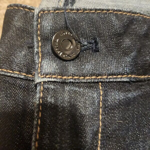 In great shape! These are a darker skinny jean with nice Distressed features on both knees. Approximately 29" inseam. These jeans are 73% cotton, 14% rayon, 11% polyester and 2% spandex.