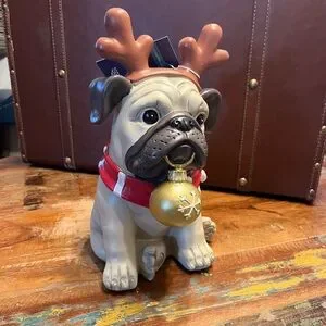 Adorable pug statue with reindeer antlers and an ornament in its mouth. Approx 11” tall.