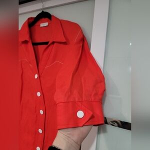 Collar, short sleeves, gathered puff at sleeves, buttoned cuffs, branded snap buttons, contrasting stitching, straight, relaxed fit, straight hem.