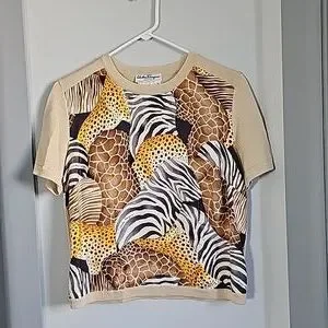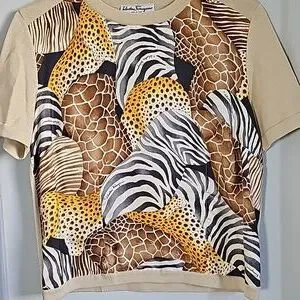 Rare find!! Authentic Salvatore Ferragamo beautiful jungle print on the front, fine gauge cotton knit in the back, sleeves, and collar/waist bands. measures 19 pit to pit and 21 shoulder to hem, giftable condition. Tan with brown, black, and white print. Stunning!