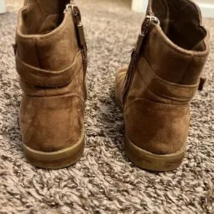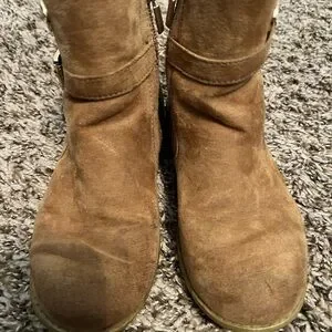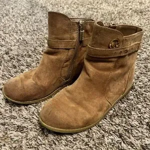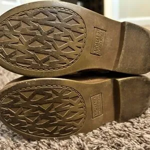 Michael Kors Girl’s bootie bots in caramel suede. Style Emma Callie - T. Zips up the side with faux buckles and the MK logo medallion. Some wear on the soles and slight discoloration on the toes, but overall still functional. Girls size 12.