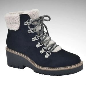 The Dock laceup bootie has the details of a classic hiker boot combined with soft coziness. Cliffs by White Mountain, this ankle boot has hiker d-ring hardware & a laceup front. It has faux shearling lining & ankle trim. Cushioned insole & a chunky low wedge. True size 6 fits size 5.5 also