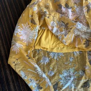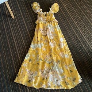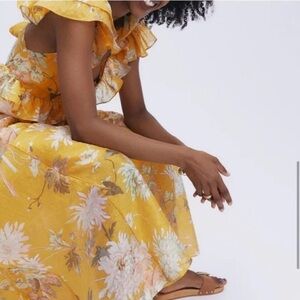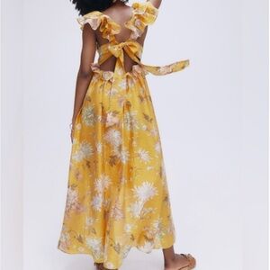 Calf-length dress in a woven lyocell blend. Deep V-neck with a flounce that crosses under the bust, a square neckline at the back and an opening at the back with wide ties. Flutter sleeves, a narrow, elasticated seam at the back of the waist and a softly draping, voluminous skirt. Partly lined. Approximate length 51”.