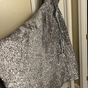Silver sequin evening gown; perfect for prom, winter ball, quinceañera. Off-the-shoulder, pleated, built-in crinoline to create a “puffy” look, lace up back, built-in bra cups. Purchased for an event, but never worn, tags still in tact.