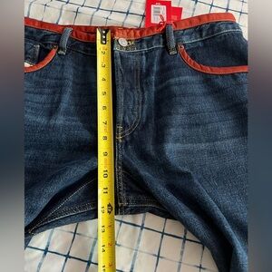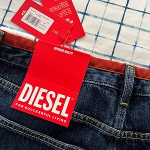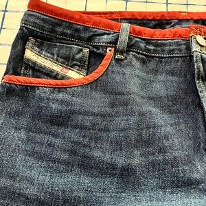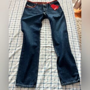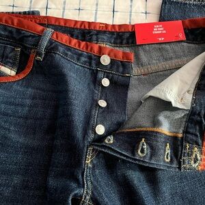 New Diesel Jeans With Red Trim. Button Fly. Size 36 x 32. (These jeans fit more like a 34.) 100% cotton. Made in Tunisia. Slim Fit. Mid Waist. Straight Leg.