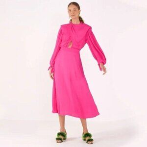 Farm Rio Maxi Dress Cut Out Satin Pink L Shoulder Pad Long-Sleeve Cocktail