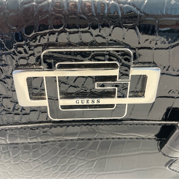 This Guess shoulder bag is a stylish and versatile accessory for any occasion. The black patent leather exterior is accented with a crocodile print and buckle and strap accents. The bag has a snap closure and a folding design that makes it easy to store in your purse.