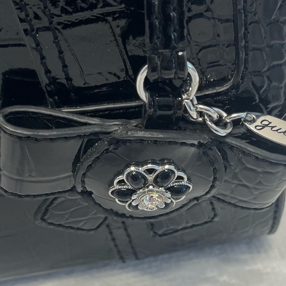 Guess Black & Silver Textured Patent Leather Shoulder Purse Fold Over Snap Close