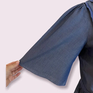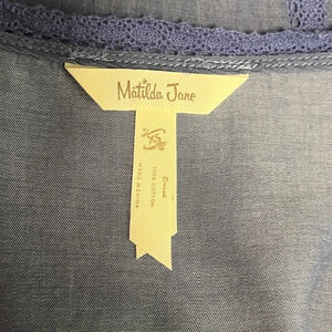This Matilda Jane Lightweight Denim Navy Cardigan Blouse is in gently used condition. Loose silhouette. Denim lace detail. Flowy 3/4 sleeve. Gathered waist detail. Ties at waist.