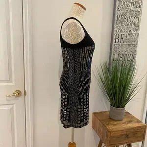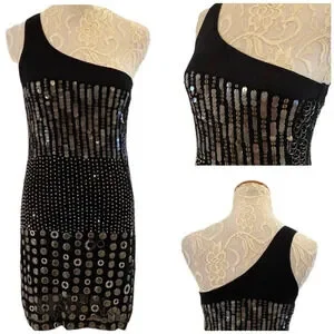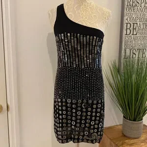 A rare find indeed! This Alice + Olivia Liquid Gunmetal One Shoulder Bodycon Dress is smoking hot! Fully engulfed with baubles, you will turn every head in the room. A simple one shoulder dress that hugs every curve. Stretchy black lace bodice above all the beading. Fully lined. There are a couple loose baubles, an easy fix, I circled the areas. The one picture is to showcase the different baubles used. In gently used condition.