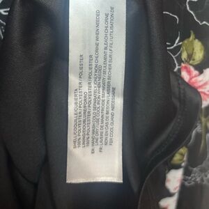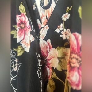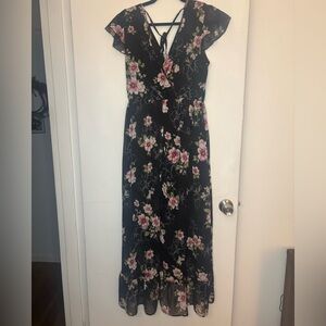Floral flowy hi-lo wrap style dress with tie on left side to adjust tightness of waist. Back has a top tie with 2 strings, and the bust features a small hidden snap for security. This dress is very comfortable and light to wear, contains black underlayer. Worn one time.