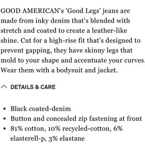 Good American Good Legs Coated Skinny Jeans are so cute! I love them but my friend told me they run small so I sized up, alas they seem to run true to size and start to fall down on me pretty quickπ«€. Super high waist, great stretch, subtle sheen on black denim. Very good condition, no stains or holes. Machine washable.