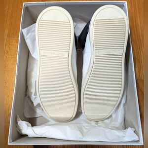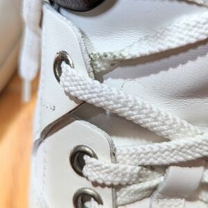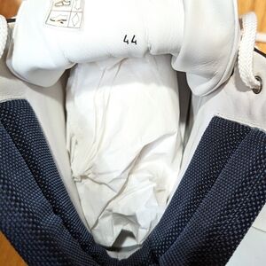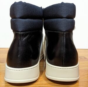 Note that some little stains on laces from the metal eyelets. Luxurious sneakers by Umit Benan. The sneakers feature leather uppers in a combination of white and black with contrasting navy fabric ankle collars. Tonal stitching running across the body provides an almost architectural element to the sky-scraping high-top design.