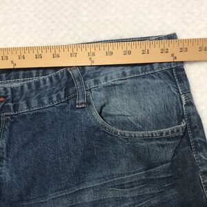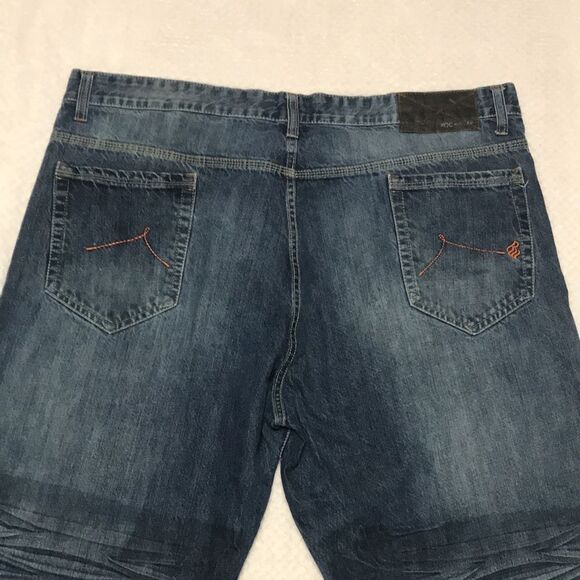 Very nice pair of classic fit Rocawear jeans in size 46/48 in blue denim fabric wash and baggy style. They have a zip closure, back pocket embroidery, logo patch. They also have distressing/whiskering. They are marked 48 waist and 34 inseam but check pictures as they appear to be 46 waist and 33 inseam. Please see photos for details and measurements. Non smoking home.