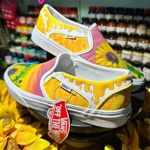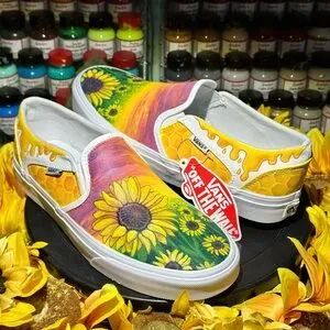 Painted with fabric paint, using a mixture of hand painting and airbrushing techniques.