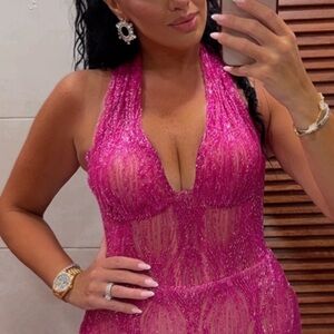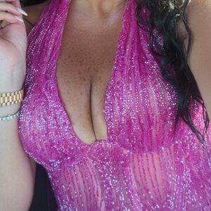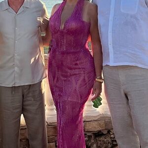 This gown is custom with a built-in corset and a tie back and cups. It’s a halter neck and a short sheer under bottom material is very high-quality and this dress is very well-made. It is such a beautiful pink/fuchsia color and the pictures don’t do it justice how gorgeous it is in person. For reference I am 5,10