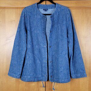 Lovely J. Jill denim colored lightweight jacket with snap front, pockets and drawstring hem. Subtle textured floral pattern throughout