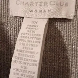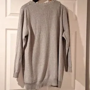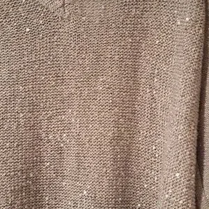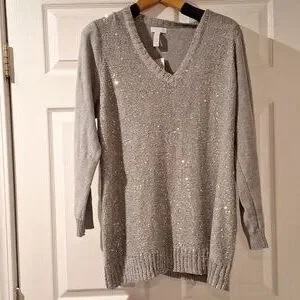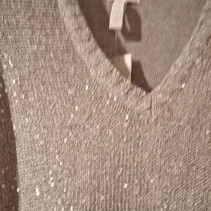 v neck sweater with sequins on the front and plain in the back. metallic gray. never bought. measures approx 27 in from armpit to armpit. length measures approx 30.5 inches from back of neck to hem