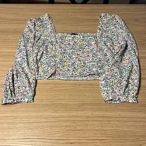 Lulus Women’s Crop Top. Large. Floral Pattern With Green, White, Pink, Purple And Yellow. Sleeve Cuffs Feature A Button Closure. Extra Button Included. Side Zipper Closure. NWOT.