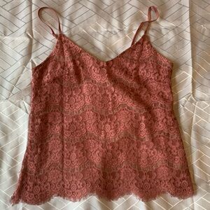 Feminine and sexy strappy peachy pink tank. Dress it up or down. Size is XS for a looser look or can fit a small/ medium for a more Va Va voom look. Lightly lined so no need for a thick bra, darting at bust. Only worn once for a bridal lunch. Great condition!