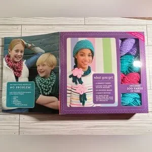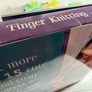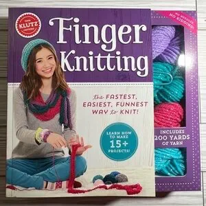 Brand New in Box Finger Knitting Kit for beginners. Knit more than 15 cute and cozy projects with your own two hands! Contains a 56-page book of instructions and inspiration, 4 skeins of shimmery yarn, a stitch holder, a lacing tool, 10 faceted beads, and 1 button. Would make a great gift for young crafters.