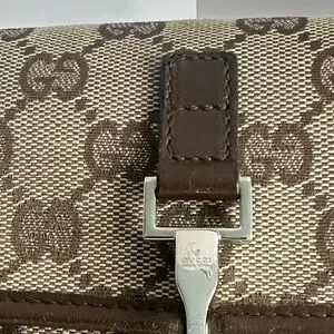 This Gucci GG Canvas Waist Bag is designed for practicality and style, featuring a combination of beige and brown hues crafted from durable canvas and leather. The bag measures 14cm in height, 17cm in width, and 5.5cm in depth, making it a compact accessory for daily use.