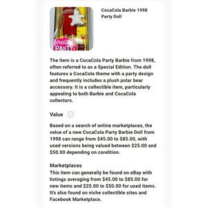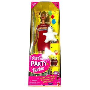 This vintage Coca-Cola Party Barbie, a 1998 special edition by Mattel, is a collector's gem. The doll comes in its original packaging, featuring a playful party scene. An ideal collectible for Barbie enthusiasts, adding nostalgia and value to any collection.