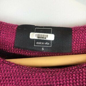 Anthropologie Dolce Vita Burgundy Beaded Gem Drop Peplum Sweater Small. There is a dry cleaning barcode sticker on the brand label. No holes or stains. Measures 16.5" across bust (pit to pit), 14.5" across waist and 23" in length from top of shoulder. Measured while flat and unstretched.