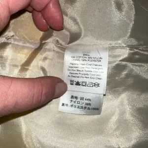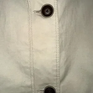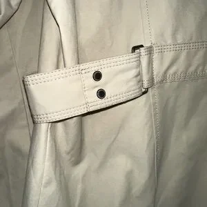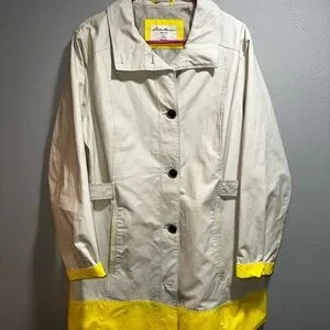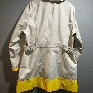 Stay stylish and comfortable with this Eddie Bauer women's rain jacket in beige and yellow. Perfect for any occasion on cooler days and nights, or those long days with some rain showers. Extra button still in tact. Like new condition. Cuffs can be worn up to show yellow or down.